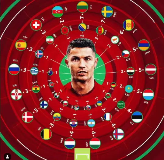 A lo largo de todo este tiempo, Ronaldo jugó distintos torneos con Portugal y ante diferentes equipos. Sus más de 100 goles se reparten entre 43 selecciones de todas partes del mundo. Las que más goles recibieron son Suecia y Lituania, ambas con 7 tantos. Uno menos sufrió Andorra, y con 5 están Armenia, Letonia y Luxemburgo.