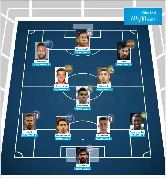 El ataque, que podría ser el de cualquier equipo de primer orden en Europa, formaría con: Lionel Messi (Argentina – 80 millones), Roberto Firmino (Brasil – 72 millones) y Neymar Jr (Brasil – 128 millones).