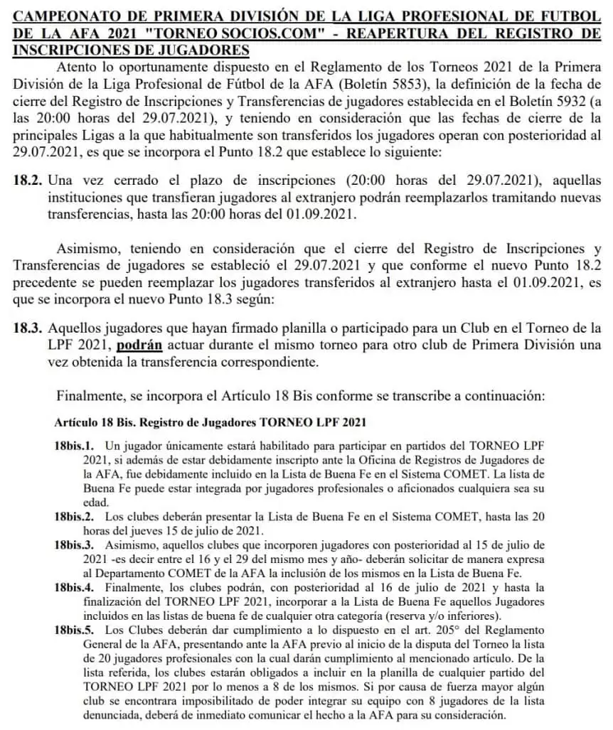 Ambas medidas ya fueron publicadas en el boletín oficial de la AFA. La primera de estas medidas indica que el equipo que venda un jugador al fútbol de extranjero después del cierre del mercado de pases (29 de julio a las 20 horas), podrá incorporar otro jugador para reemplazarlo hasta el primer día del mes de septiembre.