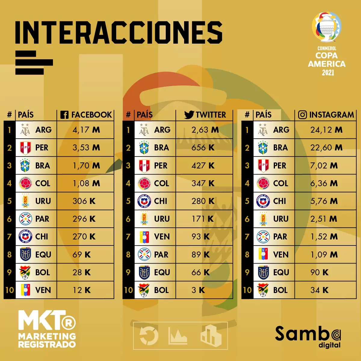 Campeona de la Copa América, Argentina también tuvo los mejores resultados en las redes sociales. Tanto en Facebook, Twitter e Instagram, la actuación de Argentina fue la mejor en el período de la Copa América del 12 de junio al 11 de julio.