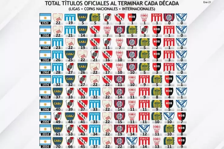 Al día de hoy la tabla está de la siguiente manera: Boca (70 títulos), River (66 títulos), Independiente (45), Racing (37), Alumni (22), San Lorenzo (22), Vélez (16), Estudiantes (14), Huracán (13), Rosario Central (11) y Newell’s (9).