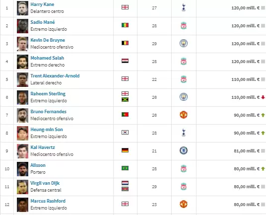 Del listado, hay un claro dominio de futbolistas del Liverpool sobre el resto. En total, hay 5 jugadores de los reds, 2 del Tottenham y Manchester City y 1 del Manchester United y del Chelsea. Hay una novedad y es que el primer puesto está compartido por 4 jugadores, todos con un valor de 120 millones de euros: Harry Kane (Tottenham), Sadio Mané, Mohamed Salah (Liverpool) y Kevin De Bruyne (Manchester City). Otra característica que comparten es que son jugadores de la zona de ataque.