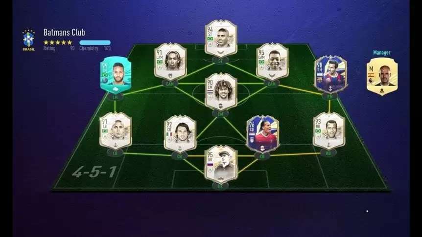 El “Batmans Club”, nombre con el que el brasileño bautizó a su equipo, cuenta con muchos jugadores íconos y muchos brasileños. Está valuado en aproximadamente 32 millones de FUT, sin incluir su carta de 99, la cual podría tener un precio cercano a los 15 millones.
