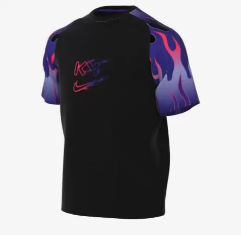 La colección está integrada por remeras, buzos, pantalones largos y cortos. Todos ellos lucen las iniciales del jugador y el logo de Nike con diseños que imitan a flamas generadas por el fuego. Justamente la colección recibió como nombre “KM Flames”.