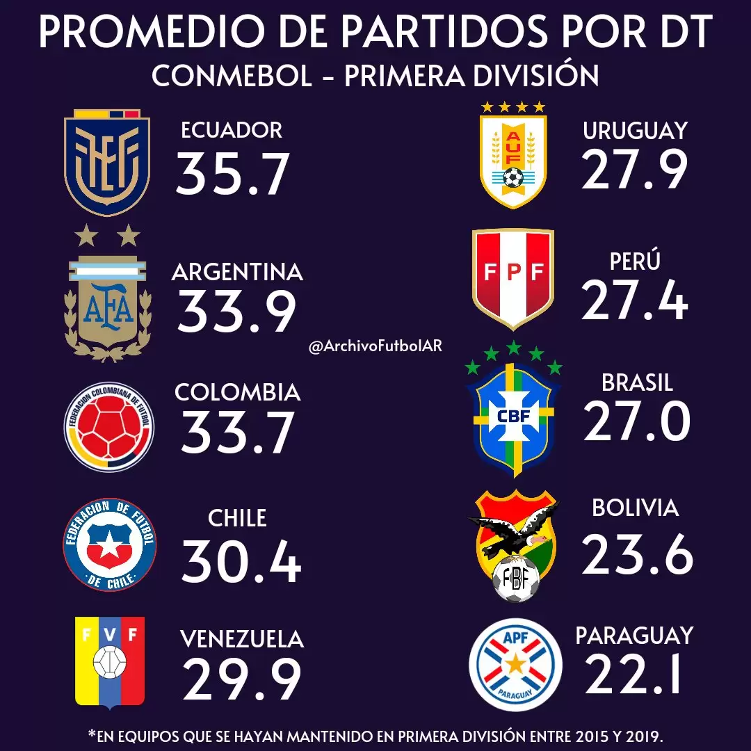 A través de un análisis de Archivo Fútbol, se reveló cuánto duran los entrenadores en sus cargos, tomando como referencia los equipos que mantuvieron la máxima categoría entre 2015 y 2019. El líder del ranking es Ecuador con un promedio de 35.7 partidos. En la temporada 2021, el 75 % de los directores técnicos de equipos ecuatorianos son extranjeros, con mayoría de argentinos aunque también hay de Uruguay, España, Colombia y Portugal.