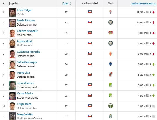 Con datos de Transfermarkt, repasamos los valores de los futbolistas más caros del mercado. Lo primero que llama la atención es que el líder del ranking no es ni Alexis Sánchez ni Arturo Vidal, 2 de los referentes del equipo nacional chileno. Quién ocupa esa posición es Erick Pulgar (Fiorentina) con un valor de 15.100.000 dólares.