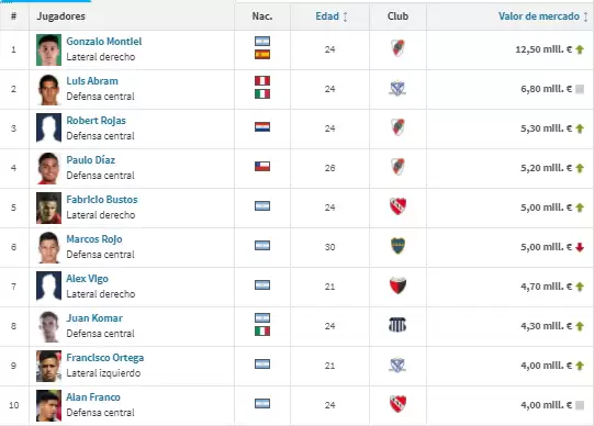 Con mayoría de jugadores de River Plate, el top 10 lo lidera Gonzalo Montiel con 15.100.000 dólares. El jugador de la Selección Argentina supera ampliamente a sus colegas. El que lo sigue, Luis Abram (Vélez), está cotizado casi a la mitad con un valor de 8.200.000. Completa el podio otro jugador de River, Robert Rojas, con 6.400.000 dólares.