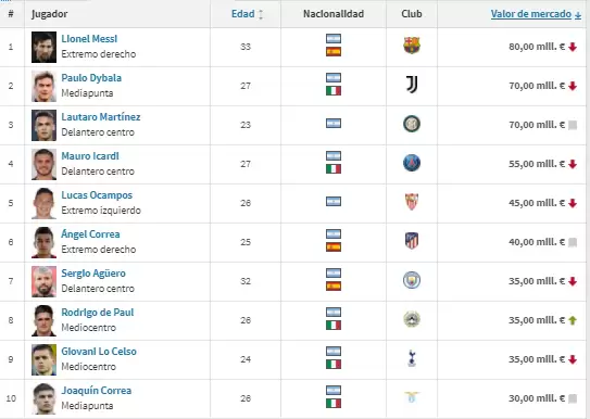 Como era de esperar, Lionel Messi se ubica en lo más alto con un valor de 96.900.000 dólares. Pese a ser el más grande del listado (33 años), el jugador del Barcelona sigue siendo considerado como el mejor de todos. El segundo lugar lo comparten Paulo Dybala y Lautaro Martínez con 84.800.000 dólares. Cierra el podio Mauro Icardi con un valor de 66.600.000 dólares. A grandes rasgos, es notorio que los delanteros suelen ser los más valorados en comparación con los futbolistas que ocupan los puestos defensivos.