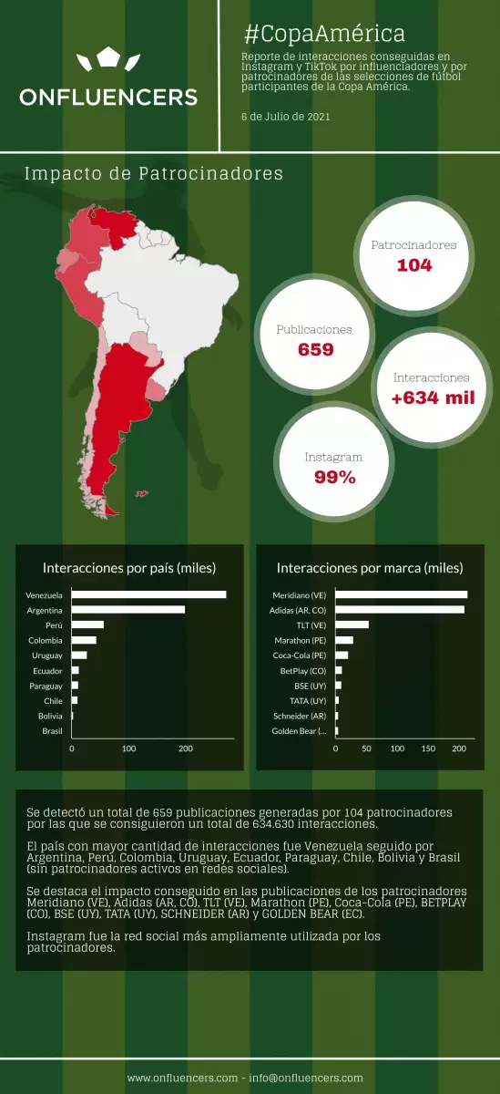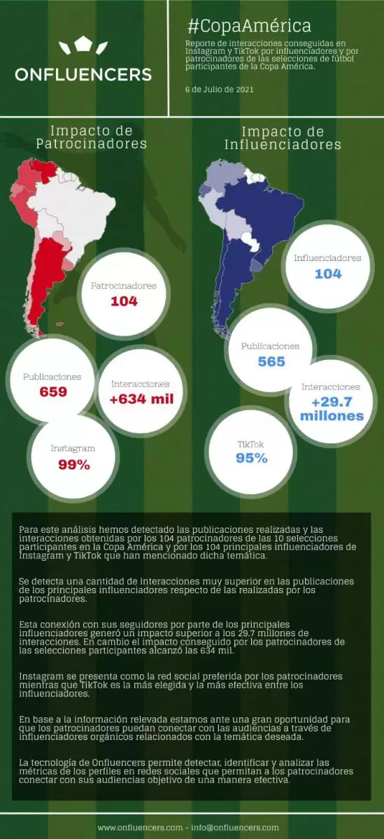 Blinker, agencia de marketing digital con alcance regional, y Onfluencers, compañía especializada en el uso de big data para la detección de influencers, presentaron un informe sobre las interacciones en redes sociales durante la Copa América conseguidas por influencers y sponsors.