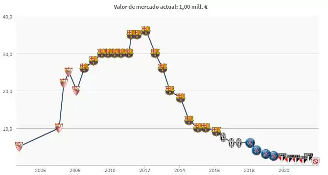Llegó al Camp Nou en 2008, procedente del Sevilla y a cambio de 35.5 millones de euros. Hoy en día su valor de mercado es de 1 millón de euros, el más bajo de su carrera profesional, según el sitio Transfermarkt.