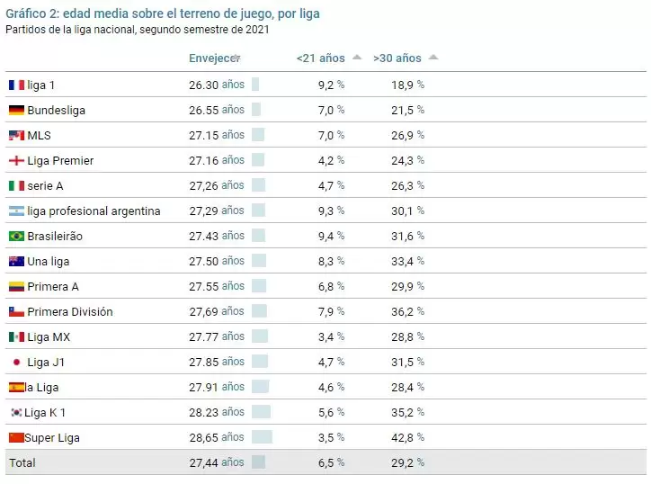En cuanto a la edad promedio de los jugadores, los campeonatos que se destacan por la utilización de jugadores menores de 21 años son: Brasil (9.4% del tiempo total de juego), Argentina (9.3%) y Francia (9.2%). Estos 3 países son también los que más futbolistas exportan a nivel mundial.