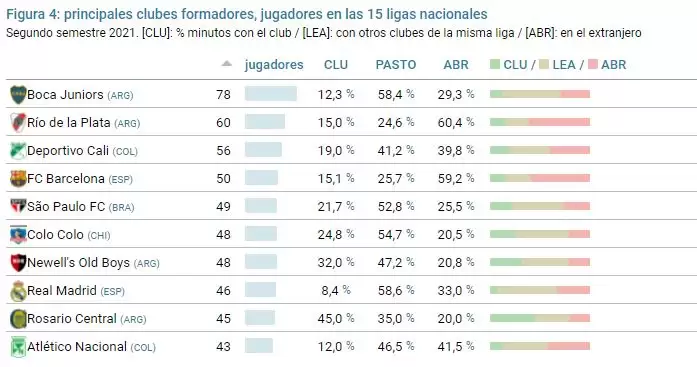 Por último, Boca Juniors es el equipo que más jugadores de las 15 ligas estudiadas entrenó. 78 futbolistas que jugaron 61.517 minutos. De esa cantidad de minutos, 12.3% lo hicieron en Boca, el 58.4% lo hicieron en otros equipos de la primera división y el 29.3% en clubes del exterior.