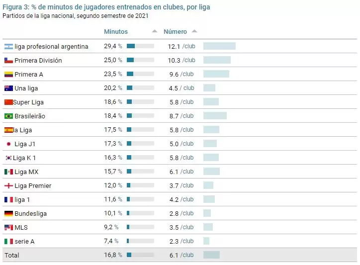 En un punto donde la liga argentina se destaca, es la formación de jugadores. La Liga Profesional de Argentina logra tener un porcentaje de 29.4% de minutos disputados por jugadores formados en un equipo de la liga. Al contrario, la MLS y la Serie A son las ligas con menos porcentaje de minutos jugados por jugadores formados en un equipo de aquella liga.