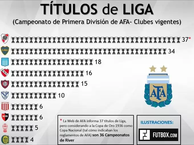 El cuadro incluye los títulos de AFA completos como también publica la web oficial del organismo rector del fútbol argentino desde su comienzo hasta la actualidad.