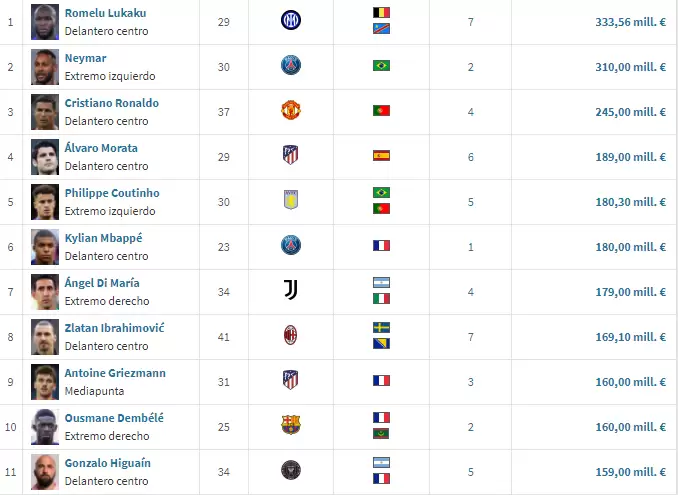 El líder de la tabla es Romelu Lukaku con 333,56 millones de euros. Lo siguen Neymar, Cristiano Ronaldo, Álvaro Morata, Philippe Coutinho, Kylian Mbappé, Ángel Di María, Zlatan Ibrahimovic, Antoine Griezmann y Ousmane Dembélé, conformando el Top 10. Luego, vienen Higuaín, Matthijs de Ligt, Eden Hazard, James Rodríguez y João Félix.
