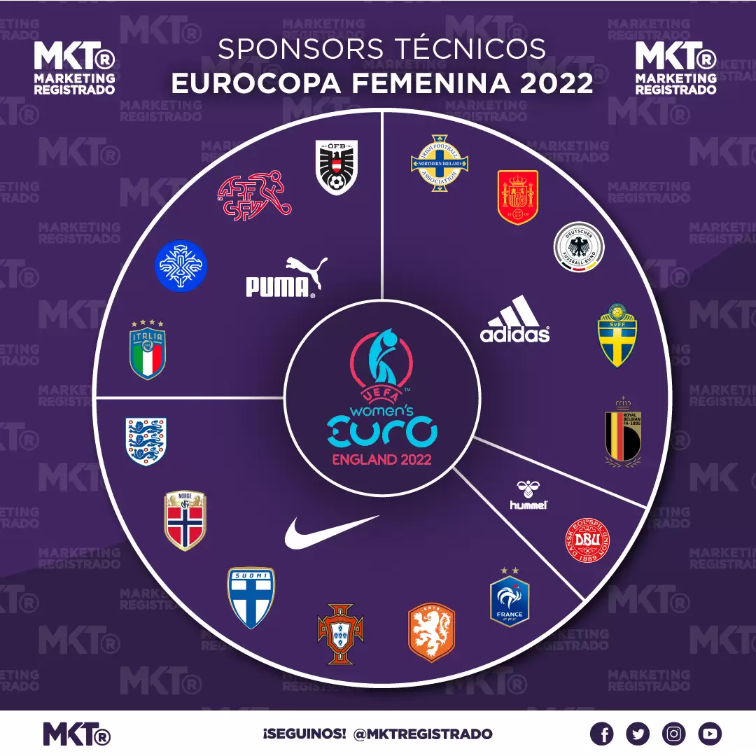 A continuación repasaremos cuáles son los sponsors técnicos que acompañarán a los seleccionados en la EURO femenina 2022. Nike es la marca que más seleccionados vestirá, en total son 6: Inglaterra, Noruega, Finlandia, Portugal, Países Bajos y Francia. Su clásico rival, adidas, vestirá a 5 seleccionados: Irlanda del norte, España, Alemania, Suecia y Bélgica. Puma tendrá a cargo la vestimenta de 4 seleccionados: Italia, Islandia, Austria y Suiza. Por último, Hummel vestirá a la selección de Dinamarca.