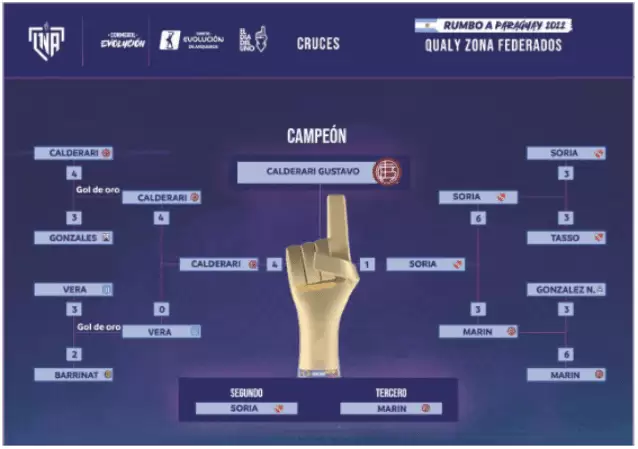 Tras superar la fase de grupos siendo el primero en su zona y el que más puntos sumó entre los participantes, Gustavo Calderari pasó con éxito a Uriel Gonzáles (Ferro Carril Oeste) en cuartos de final, a Iván Vera (Racing Club) en semifinales y a Rodrigo Soria (Independiente) en la final. Curiosamente, los finalistas se enfrentaron en la primera fecha del Grupo A, con victoria del portero granate por 6-1.