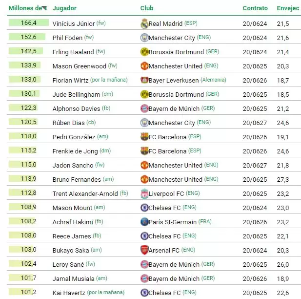 La estrella en ascenso es el jugador del Real Madrid, Vinicius Junior cuyo valor es de 166 millones de euros y supera a Phil Foden y Erling Haaland. Si repasamos puesto por puesto, los valores máximos los obtuvieron: Gianluigi Donnarumma, Rúben Dias, Alphonso Davies, Jude Bellingham, Florian Wirtz y Vinícius Júnior.