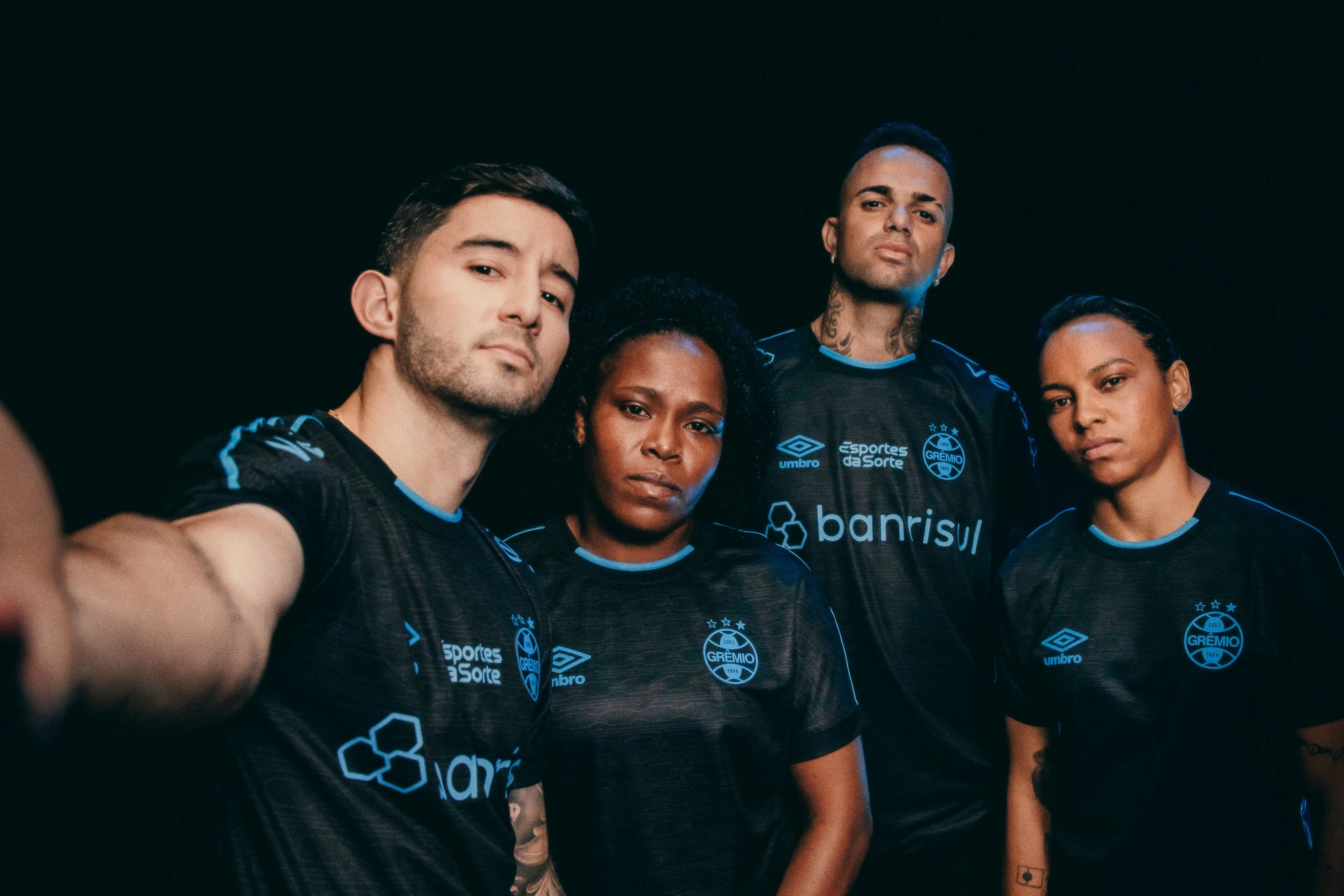 Totalmente en negro con detalles de filigrana, con formas intercaladas con el nombre “Grêmio” entre ellas, el nuevo manto también tiene detalles en cian, tanto en el hombro como en el cuello, así como en los patrocinios, nombre, número e, incluso, como un detalle en el símbolo del Inmortal, formado únicamente por líneas azules con fondo negro.