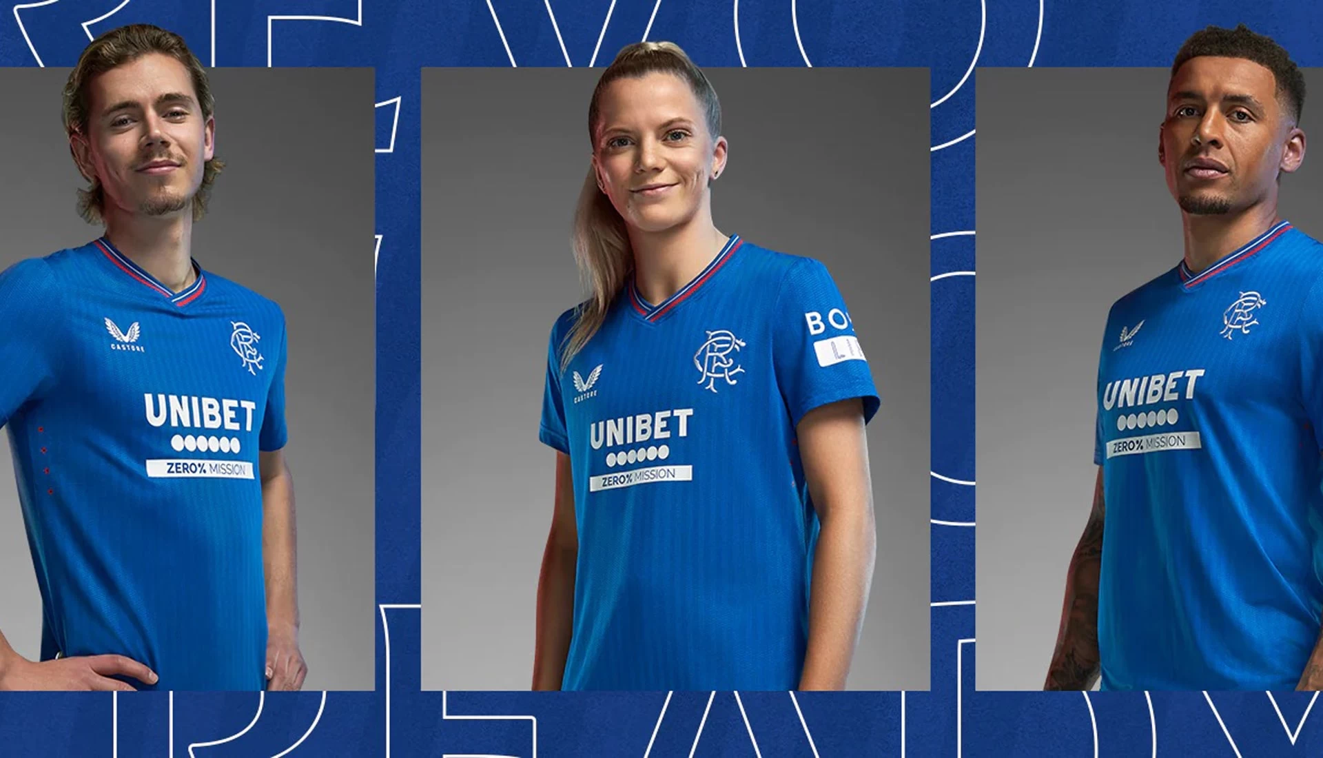 En esta oportunidad, en conjunto con Castore, el conjunto escocés mantiene el estilo clásico con el azul real como predominante, con un ribete blanco y rojo en el cuello en V superpuesto. A lo largo del cuerpo, recorren unas rayas verticales, como aquella pilcha que vistió entre 1982 y 1984. Además, los logos de su sponsor técnico y main sponsor, y el escudo del club se destacan en blanco.