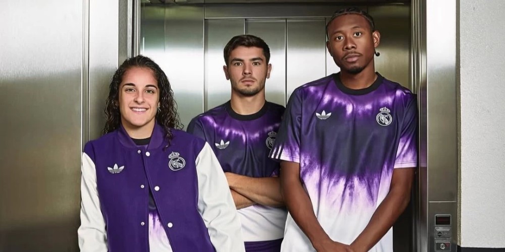 La indumentaria del equipo español se presenta en blanco y violeta, destacando la camiseta confeccionada con la técnica del tie-dye. Los símbolos de adidas y Real Madrid aparecen en blanco. Este uniforme será utilizado en la previa de algunos partidos.