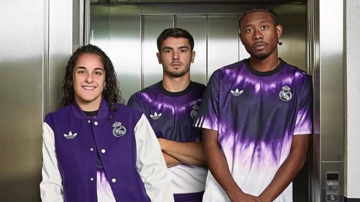 La indumentaria del equipo español se presenta en blanco y violeta, destacando la camiseta confeccionada con la técnica del tie-dye. Los símbolos de adidas y Real Madrid aparecen en blanco. Este uniforme será utilizado en la previa de algunos partidos.