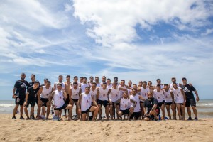 El conjunto de Nueva Pompeya está realizando la pretemporada en Pinamar y en estos días es noticia por el curioso método de entrenamiento. El mismo consta de entre tres y cuatro turnos por día y el arranque de las practicas son de madrugada en la playa.