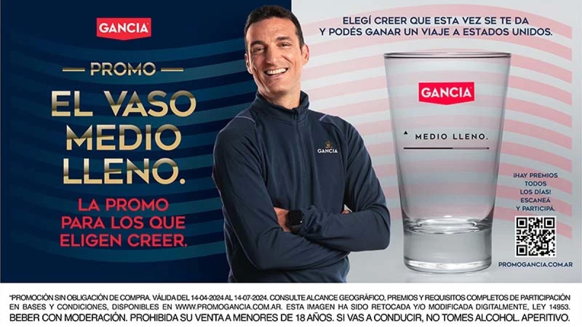 “El Vaso medio lleno” es la premisa que inspiró a Gancia a unirse al director técnico del equipo argentino para convocar “a todos aquellos que eligen creer” a participar de la promo que entrega como premio mayor un viaje para dos personas a Estados Unidos para alentar a Argentina en fases de grupos y volver a ilusionarse con aquellos que tanta alegría trajeron al país.