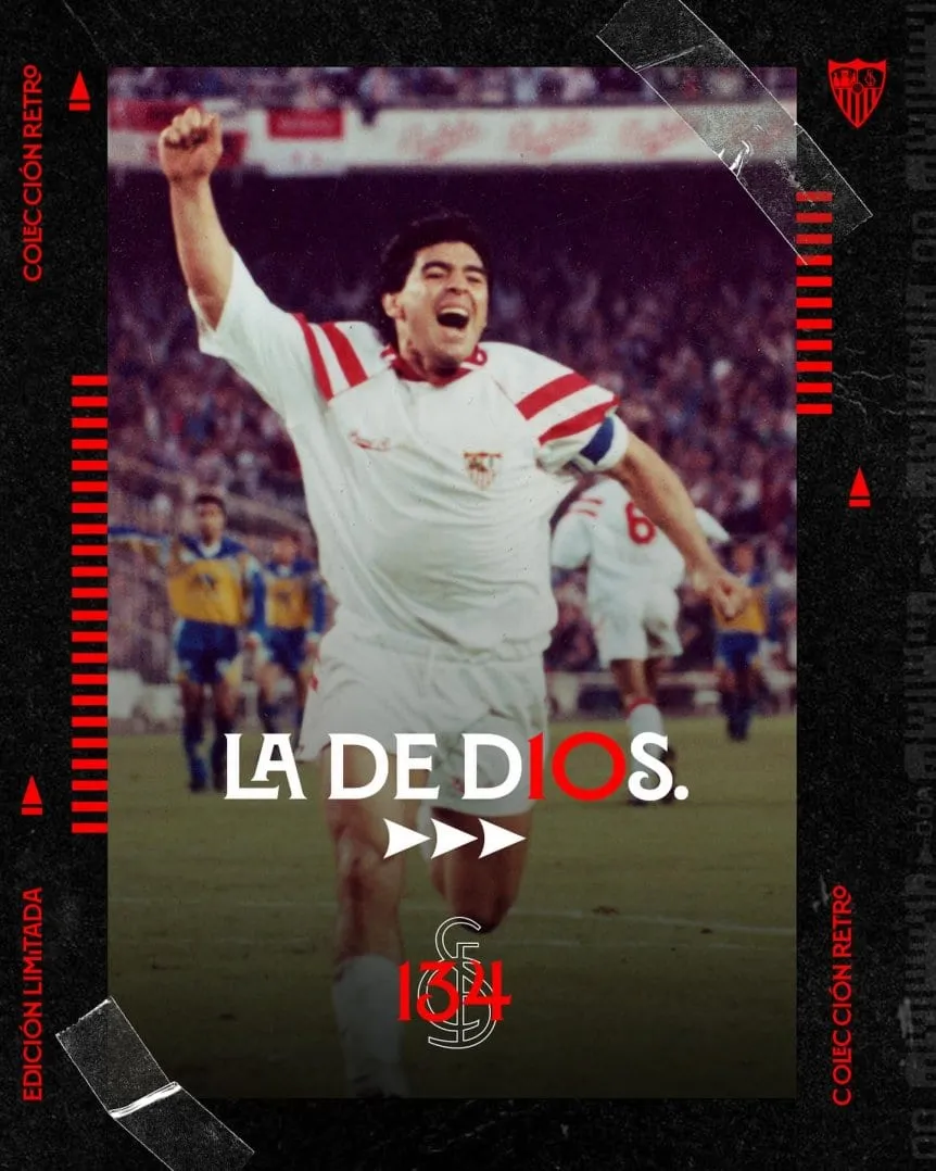 A poco más de tres años de su muerte, Diego Armando Maradona sigue vivo en el corazón del mundo del fútbol, sobre todo aquellos equipos en los que tuvo un paso, aunque sea breve, como es el caso de Sevilla, que fue casa de Pelusa en la temporada 1992-93 y este jueves, día en el cumple 134 años de historia, presentó una línea retro con el nombre 'La De D10s' en homenaje al astro argentino.