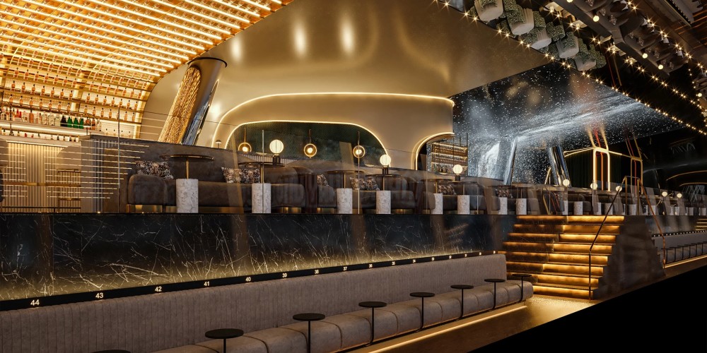 La configuración de los espacios del Skybar se dividirá en 4 grandes zonas y alturas. La zona de restauración y discoteca estará ubicada en los respectivos extremos del Skybar, la zona central estará presidida por una gran barra y el singular botellero envolvente, y finalmente, la zona de gradas y palcos VIP enfocados a dar privacidad y generar vistas al terreno de juego durante los días de partido. El espacio también cuenta con dos terrazas en ambos lados, de 250m2 cada una, que toman inspiración de los kioskos madrileños y sus emblemáticos parques.