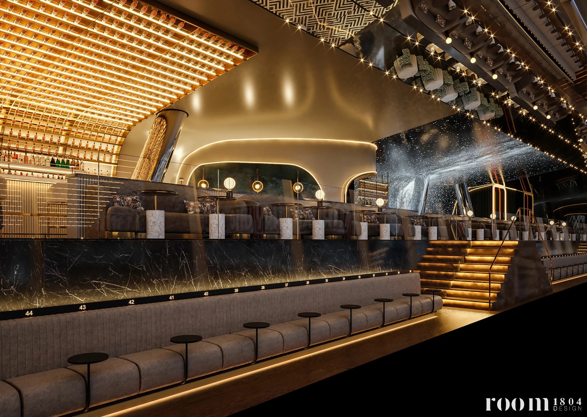 La música de los Dj's del mega palco parará por completo y será el sonido ambiente, los gritos y cánticos de la afición blanca, el que inunde el Skybar para impregnar la zona del entorno que regala el Bernabéu en un día de partido. Una gran embocadura de bronce retroiluminada enmarca la cabina, acompañado de las pantallas que envuelven el espacio, un espacio estratégicamente ubicado para que sea visible desde todo el espacio del Skybar. La pared será una constelación de estrellas para ilustrar a un club que siempre ha llenado su plantilla de Galácticos y que luce más estrellas en su pecho que ningún otro club.