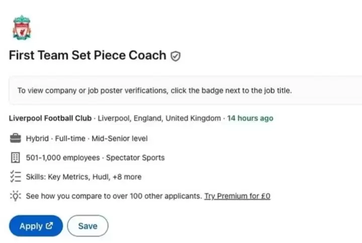 El anuncio, publicado por la cuenta oficial del club en dicha red social, describe a la persona ideal que necesitan los Reds y exige ciertos requisitos para postularse al cargo. El primero de ellos, excluyente, es que la persona elegida tenga la "licencia UEFA A" y ser capaz de maximizar el rendimiento del equipo en todas las situaciones de pelota parada.