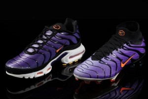 La colección fusiona el diseño característico de Air Max con la silueta de Nike Mercurial Superfly, con esa estética ondulada instantáneamente reconocible que se desarrolla en tonos morados y negros en ambos conjuntos de calzado.