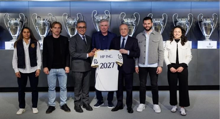 Tras muchos años con los activos de la camiseta bloqueados por la aerolínea Emirates, su patrocinador principal, Real Madrid anunció un acuerdo con HP para que la compañía tecnológica estampe su logo en la manga de la camiseta blanca. El trato es hasta 2027 e incluye explotar la manga de la camiseta en todos los equipos de fútbol del club, incluido el femenino y la cantera.