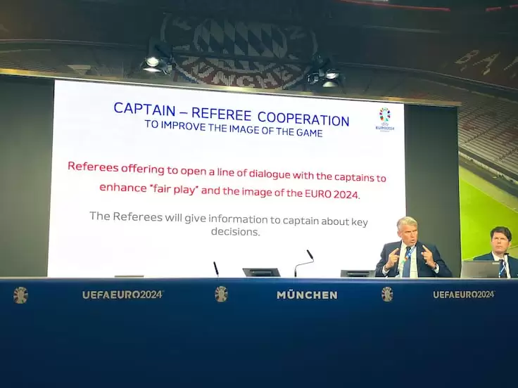 Roberto Rosetti, jefe arbitral de la UEFA, explicó la medida que aplicarán los jueces durante la Eurocopa. Solamente podráa acercarse a hablar el capitán, los demás, si lo hacen, serán amonestados. “No lo hacemos por los árbitros, lo hacemos por el fútbol. Por el futuro. Por los jóvenes y los que quieran ser árbitros”, dijo el dirigente. Esta decisión tienen que ver con la necesidad de evitar que los árbitros tengan que dar explicaciones a once jugadores a la vez en la toma de decisiones controvertidas. Además, añadió que, en el caso de que las protestas continúen, será el capitán del equipo en cuestión quien reciba la tarjeta por no haber podido controlar a sus compañeros.