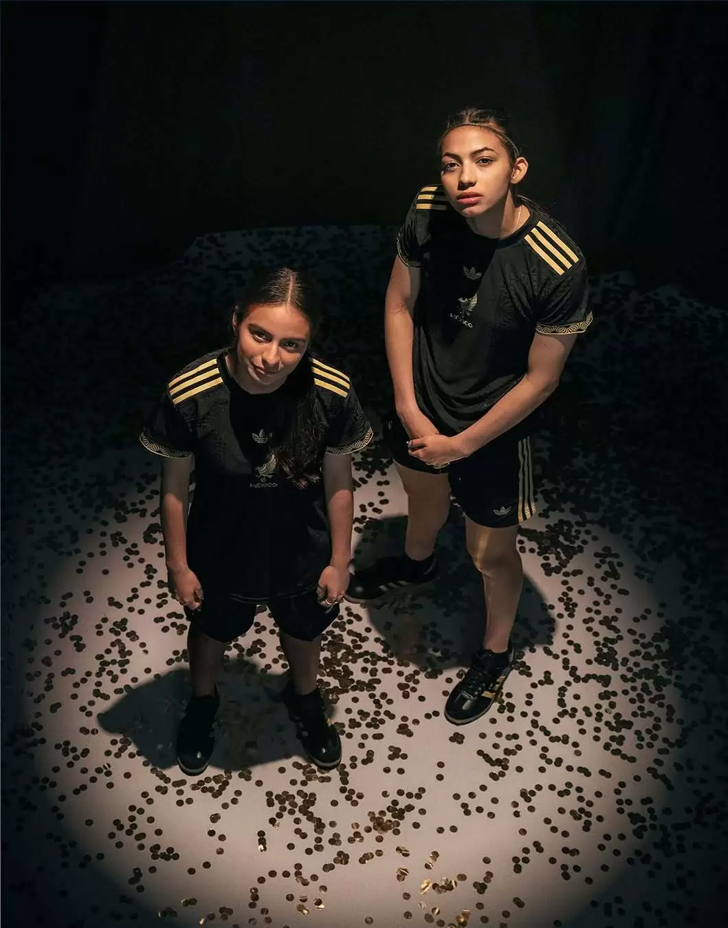 El diseño de la camiseta rinde homenaje a una época en la que el cine mexicano conquistó la pantalla grande y tuvo un profundo impacto en la identidad de la nación, mezclando el patrimonio cultural del país con modernidad y sofisticación. La camiseta celebra la vibrante cultura de México, incorporando elegancia y refinamiento que reflejan el alma del país. El negro regresa al centro de atención, esta vez enriquecido con detalles dorados, desde las Tres Franjas hasta el escudo mexicano deconstruido, ubicado junto al logotipo del Trifolio de adidas en el centro de la camiseta. Las mangas con detalles intrincados y la base de jacquard aportan textura, y hacen referencia a los adornos bordados de los trajes de los mariachis.