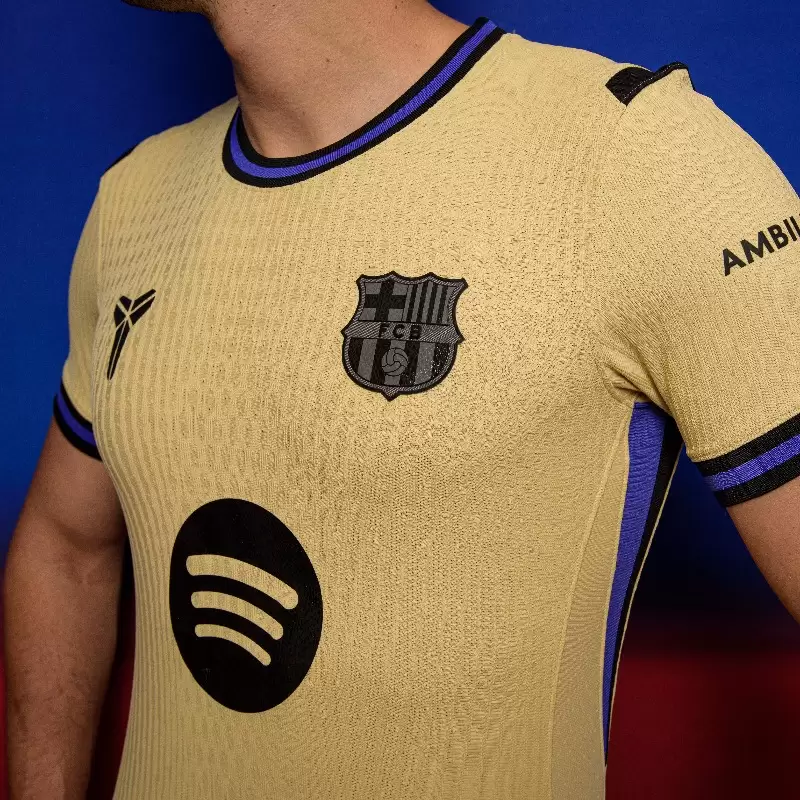 El uniforme es predominantemente dorado, con toques de violeta persa y negro. El símbolo de Kobe aparece con una textura de piel de serpiente en 3D, el mismo patrón que se usa en el escudo del club. El logotipo del patrocinador Spotify aparece centrado en el pecho, mientras que Ambilight (en las camisetas masculinas) y Bimbo (en las femeninas) están estampados en las mangas. Además del uniforme, la colaboración incluye una línea completa de productos: camiseta pre-partido, equipación de baloncesto, camperas y zapatillas deportivas Barça x Kobe edición limitada.