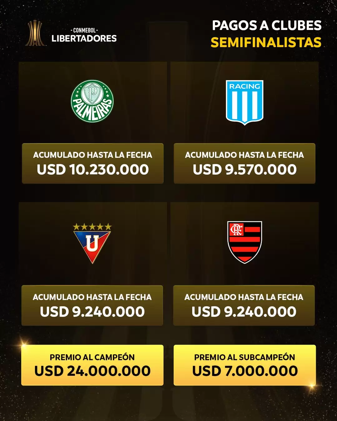 Hasta el momento, Palmeiras encabeza la lista con USD 10.230.000 acumulados en premios, seguido por Racing Club con USD 9.570.000, mientras que Flamengo y Liga de Quito registran USD 9.240.000 cada uno. Además, el campeón de esta edición recibirá USD 24.000.000, mientras que el subcampeón se llevará USD 7.000.000, consolidando un récord histórico en la distribución de ingresos de la competencia.