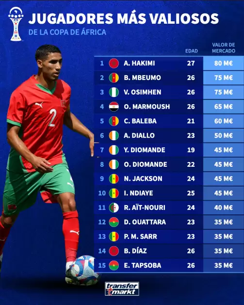 Tras la última actualización de valores de mercado realizada por Transfermarkt, la Copa África vuelve a confirmar su peso en el fútbol internacional. El jugador más valioso del certamen es Achraf Hakimi, tasado en 80 millones de euros. El lateral del Paris Saint-Germain no solo lidera el ranking del torneo, sino que también es el defensor más valioso del mundo en su posición.