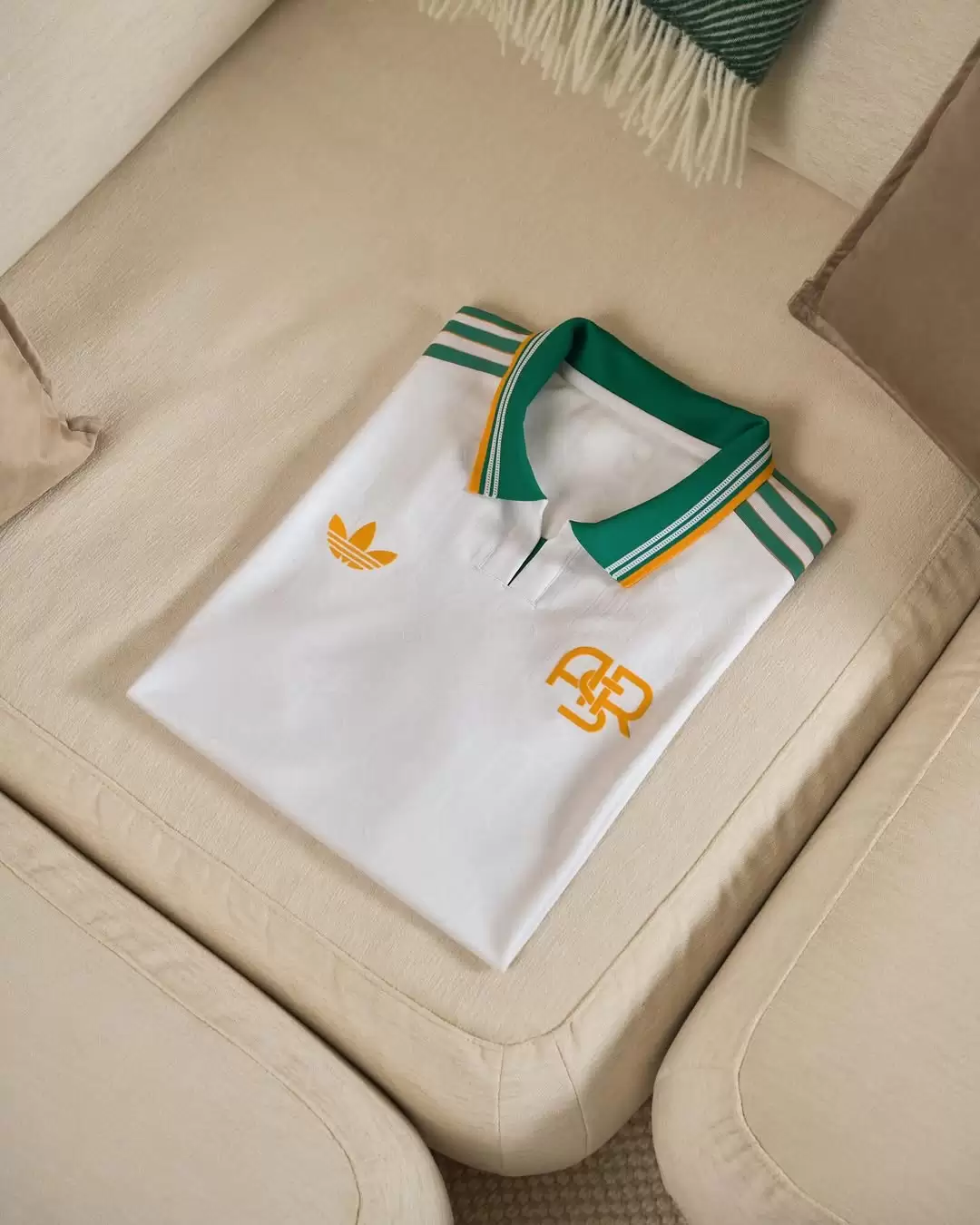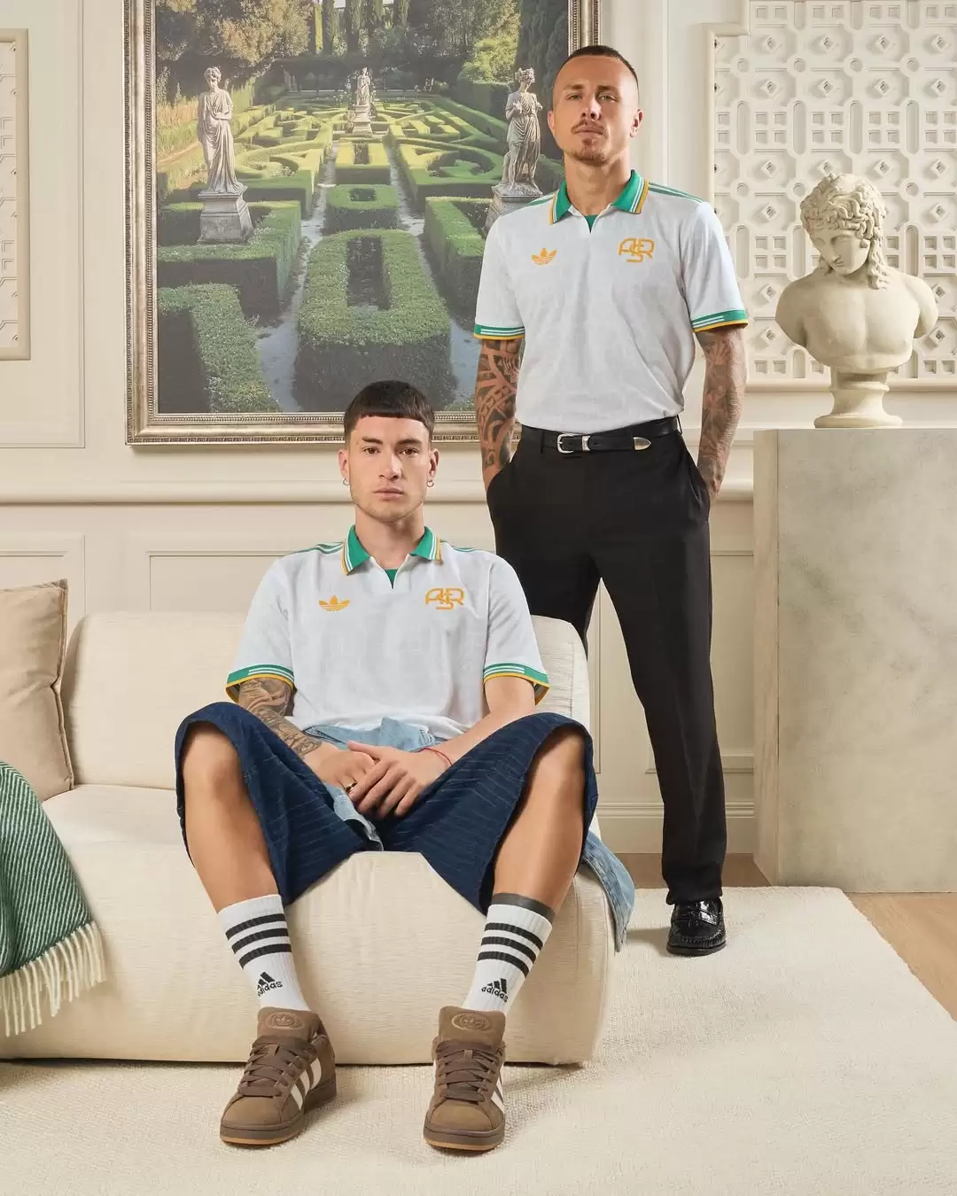 Un tono verde esmeralda acentúa la base, apareciendo en el cuello, los puños y el logo de las tres rayas. Se combina con un amarillo vibrante, utilizado tanto en el icónico logo del Trifolio —un elemento básico de varias terceras equipaciones de adidas esta temporada— como en el tradicional trigrama "ASR", un detalle que ha regresado a las terceras camisetas de los Giallorossi en los últimos años.