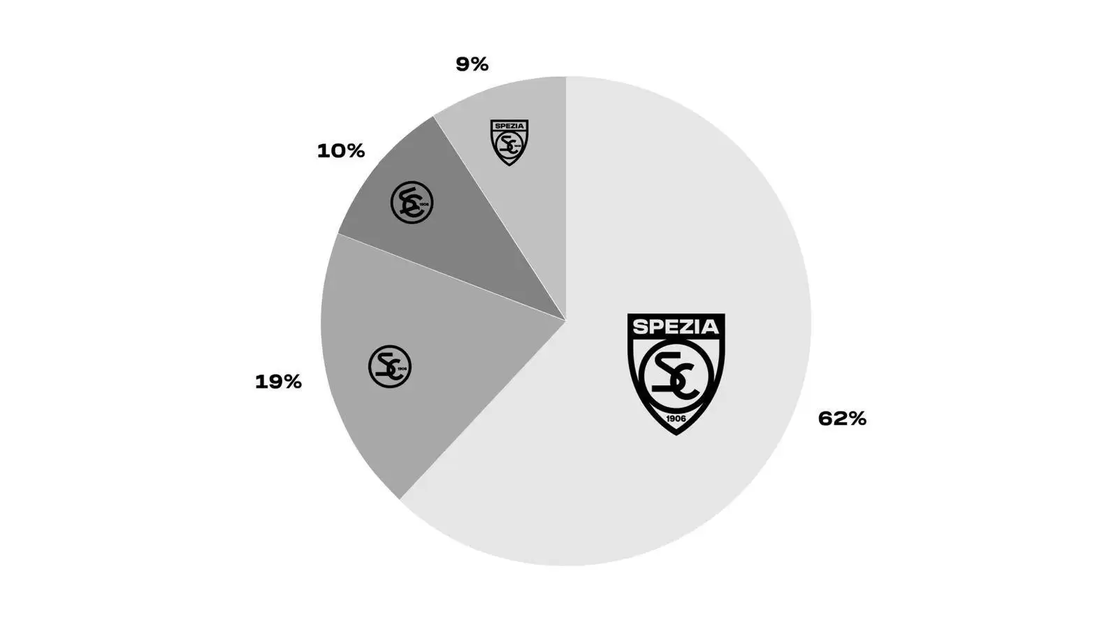 La base del nuevo escudo reside en la elección de las letras S y C, en referencia al Spezia Calcio, dentro de un círculo. Este patrón sirvió de base para los cuatro escudos, entre los cuales los hinchas podían elegir su favorito. El logotipo ganador, con el 62 % de los votos, se asemeja al escudo utilizado en 1944, año en que el Spezia ganó el Scudetto. Las proporciones se han recalibrado para alinearse con los estándares gráficos modernos, preservando al mismo tiempo la identidad histórica. Se ha elegido una única versión en blanco y negro, que enfatiza la esencialidad, la sobriedad y la sólida identidad visual del club.