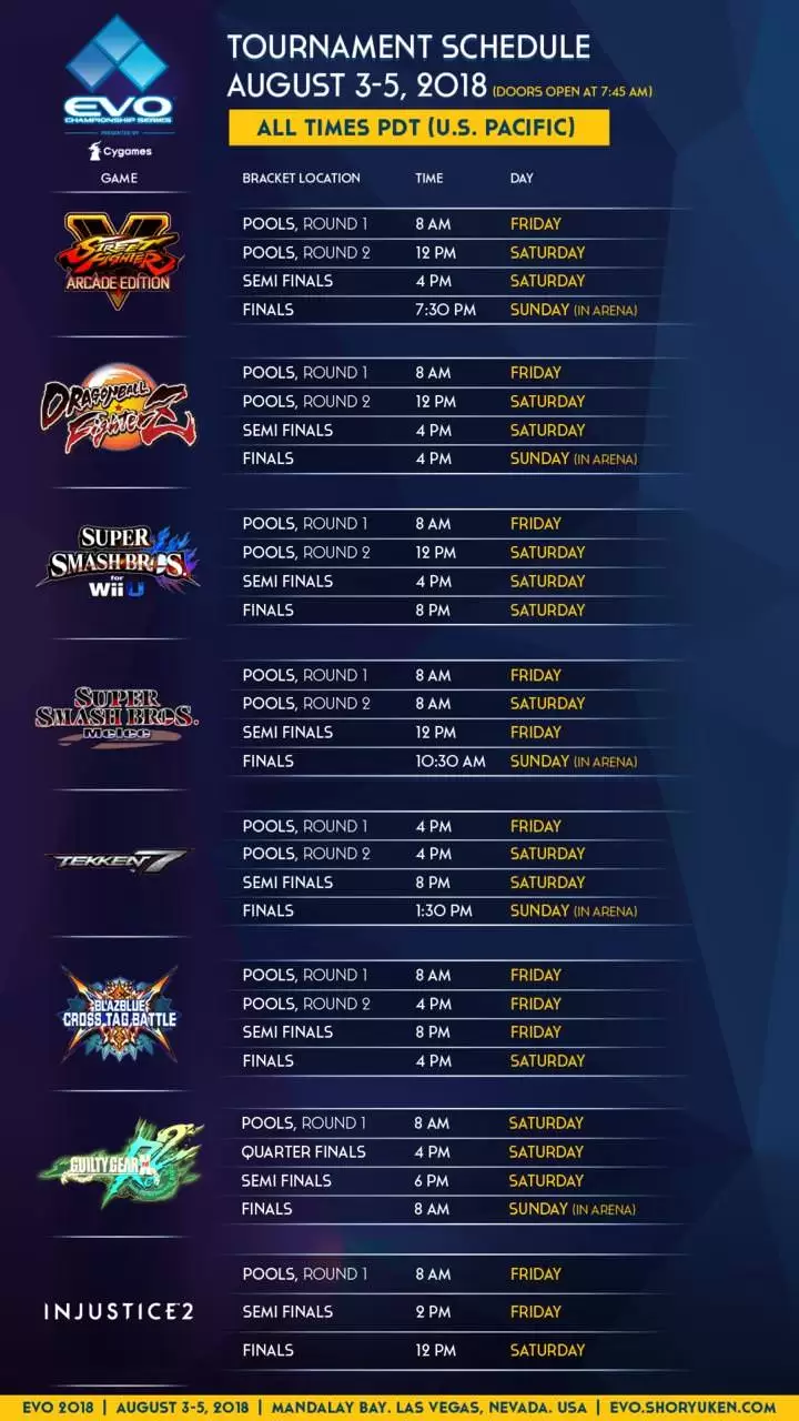 Este año hay ocho juegos como atracción principal, entre los que se incluyen el Super Smash Bros. Melee, Super Smash Bros. Wii U, Tekken 7, BlazBlue: Cross Tag Battle, Street Fighter V: Arcade Edition, Injustice 2 y Guilty Gear Xrd Rev 2.