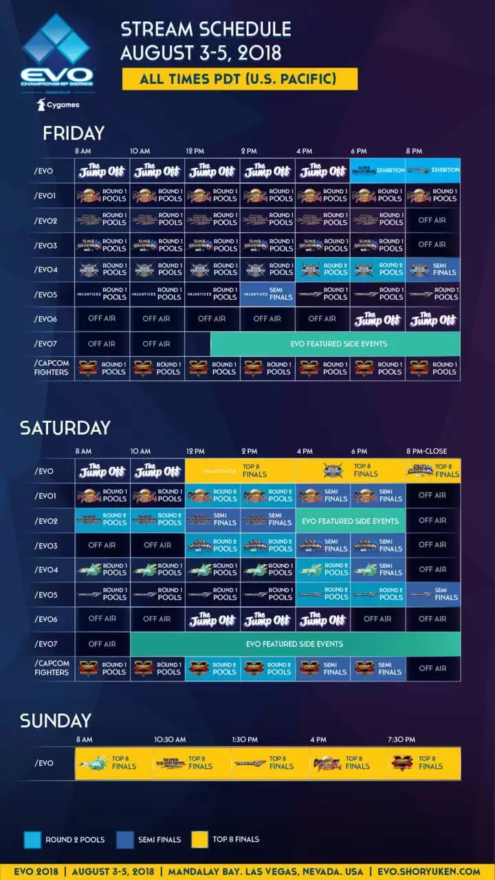 La EVO va a estar transmitiendo todos los encuentros mediante Twitch, gracias a un nuevo partnership con la empresa de Amazon para transmitir los duelos. La única excepción será el Street Fighter V, cuya transmisión estará a cargo de Capcom Fighters Channel. Las competencias arrancan el viernes a las 10:00 (Bogotá y Quito), 11:00 (Asunción) y 12:00 (Buenos Aires y Montevideo) y seguirá durante el fin de semana, con las finales disputándose el domingo 5 de agosto.