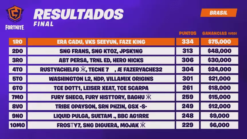 El equipo cerró las finales con un total de 334 puntos, este resultado viene de 208 unidades por colocación y 126 eliminaciones. En 12 partidas que se disputaron, ganaron 2 y tuvieron una media de kills de 5.2, junto a una media de posiciones de 9.3. El trío del segundo puesto se llevó un premio de 48 mil dólares y estaba compuesto por: los brasileños JpsK1ng, Frans y Kitoz, mientras que el tercero consiguió una suma de 30 mil dólares, también todos brasileños, fueron: Persa, Hero Nicks y TRNL Ed.