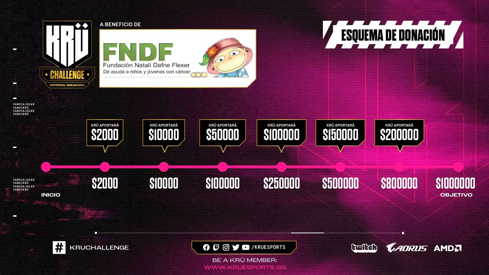 El horario de comienzo será a partir de las 18hs. El total de lo recaudado en la transmisión por Twitch será destinado a la Fundación Natali Dafne Flexer, que ayuda a más de 1.500 chicos con cáncer en todo el país para que puedan acceder a la atención que necesitan con un tratamiento integral. Noelia Forte(@kronopia) y Efe Gonzalez (@efecdb) estarán a cargo de la animación desde el canal oficial de KRÜ. El hashtag oficial de la transmisión será #KRUChallenge.