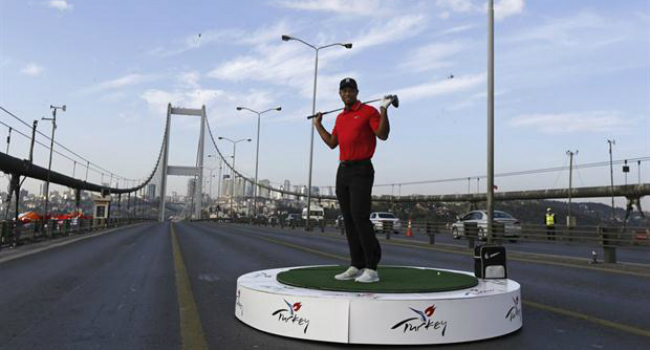 El mejor jugador de golf del planeta realizó una acción para promocionar el torneo Turkish Airlines Open 2013, que se celebrará del jueves al domingo en la ciudad turca de Antalya, y en un hecho único unió a Asia y Europa con una serie de tiros de golf.