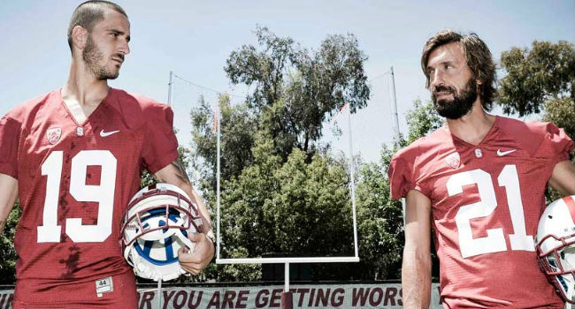 Fue en el campo de entrenamiento, y con la ropa de los Stanford Cardinal que Pirlo y Bonucci probaron sus habilidades para el fútbol americano. Lejos de ser buenos con las manos, ratificaron sus habilidades futbolísticas cuando pusieron la ovalada en el piso, y probaron los envíos a los postes.