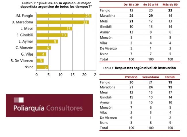 La consultora Poliarquía realizó una encuesta entre 1.000 personas mayores de 18 años para saber quiénes eran considerados los mejores deportistas argentinos de la historia. El resultado, más que parejo, arrojó ganador a Juan Manuel Fangio con el 23% de los votos, seguido por Diego Maradona con el 22%.