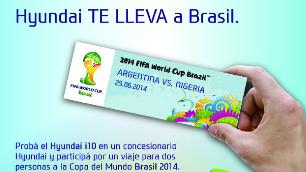 Hyundai Motor Argentina anunció el lanzamiento de su promoción `Hyundai te lleva a Brasil` que consiste en probar el i10 y participar por un premio de un viaje para dos personas al partido de Argentina vs Nigeria a llevarse a cabo en la sede de Porto Alegre el próximo 25 de Junio. La acción tiene la finalidad de acercarse a los potenciales clientes con el fin de que puedan percibir en forma directa y personal la calidad y las características dinámicas del vehículo. Para participar, solo hay que dirigirse a los concesionarios Hyundai de todo el país y hacer el test drive antes del 30 de abril.