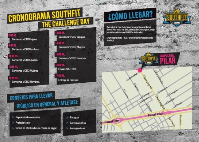 Este sábado 15 de noviembre se realizará en el Campus de la USAL (Universidad del Salvador), en la localidad de Pilar, la final de SouthFit the Challenge 2014, una de las competencias internacionales más importantes de CrossFit en Argentina. Con participantes de distintas partes de América, los finalistas competirán por ser la mujer, el hombre o el equipo mixto con mejor condición física de la región.